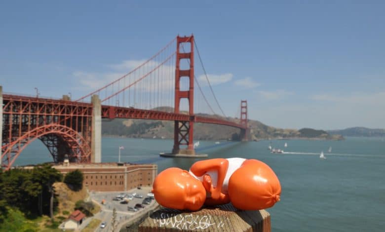 Hans Wurst on the wooden planks of Pier 39Miriam Pfannmüller reports: “We breathe the air that smells of fish, salt and people. I want buffoon the Pier 39 show and place it on the wooden planks by the water. Behind me, someone is sleeping on a bench. A man in stature. He’s wearing a high-visibility vest over his black hoodie that says fuck the dodgers, sandals, and amazingly white socks. His few belongings are stacked on a luggage cart next to him. Amazing, umbrella and flag are included. Maybe it doesn’t need more to live. Hanswurst is nice and relaxed and I can get some good shots in front of the sea lions. They make me laugh out loud in their stacked wildness.”