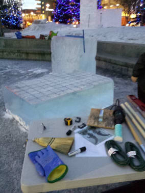 paper (if the temperature looks to be warmer). For their sculpture of a bird, they traced the grid’s shapes on the ice blocks with black markers from a laminated sheet of paper. And then the work of chipping away begins—first with a chainsaw and then moving to more delicate tools to create the fine lines.