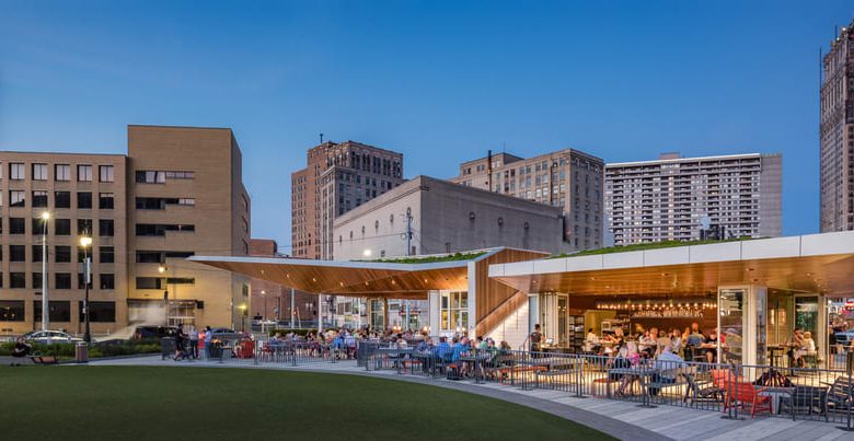 AutoCAD and the Architecture toolset help the company design for tight urban sites, manage zoning requirements, maintain historical oversight, and invest in a mission of environmentally responsible design. This certainly held true for the recent design in downtown Detroit. Formerly a desolate, nearly 10,000-square-foot lot on Grand River Avenue, Beacon Park is now home to an expanse of green space (by livingLAB landscape architects) and a restaurant with Lumen.