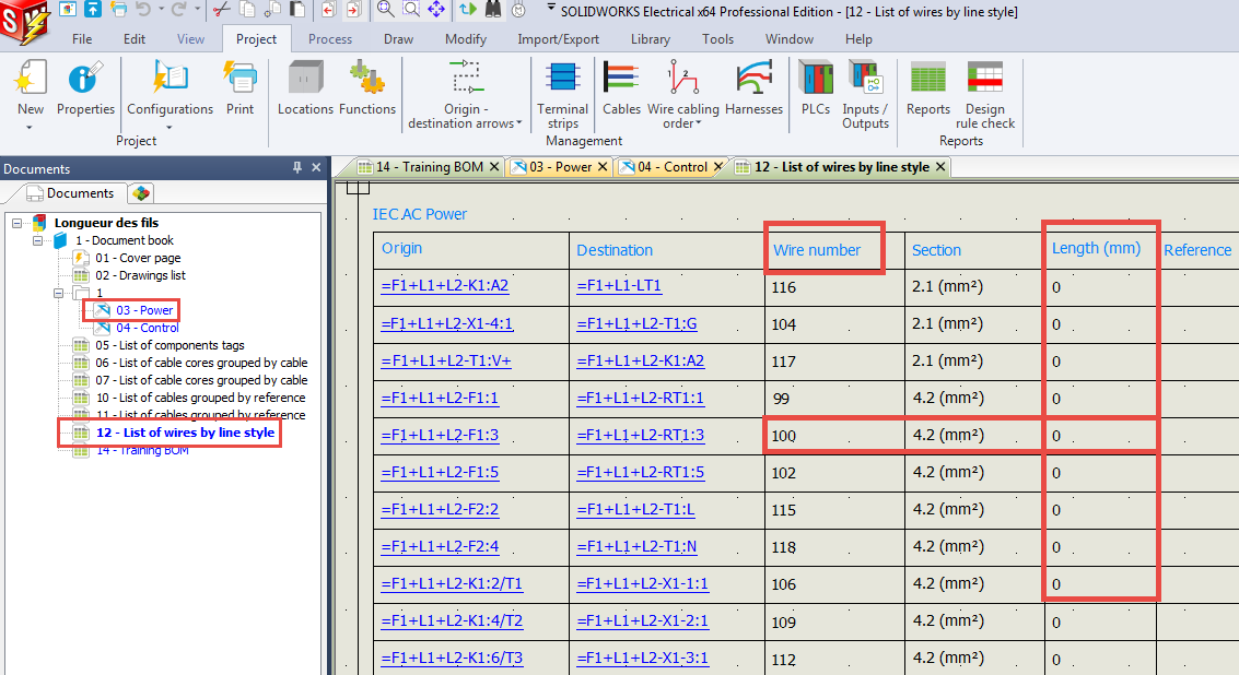 We have in our current project, several electric wires for which we have not defined the lengths, hence the value zero (0) in the length column of the report as in the following illustration: